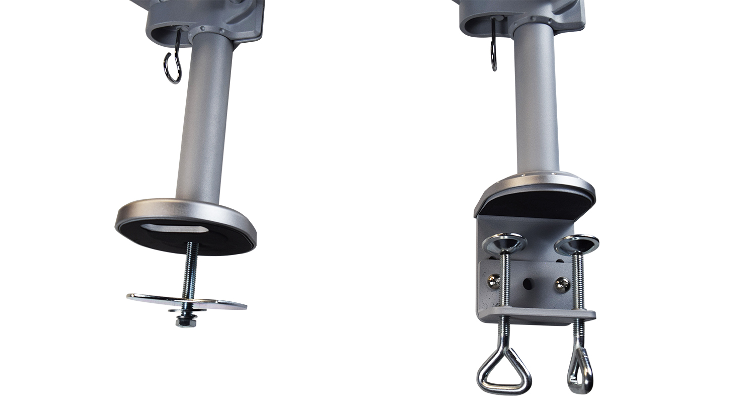 Double monitor displays are rising in popularity, and our TREX arms will pick them off your work surfaces. Dual arms have a weight capacity of 12 pounds per monitor. Available in clamp or grommet style and includes wire management.